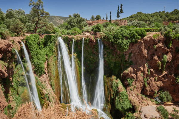 - As you approach, the sound of cascading water grows stronger. Then the view opens: a dramatic drop of more than 100 meters, where the waterfalls tumble into a green canyon below. You descend the scenic trail with your guide, passing local cafés carved into the cliffs, fig trees rustling above, and perhaps even a few curious Barbary macaques watching from the trees.
